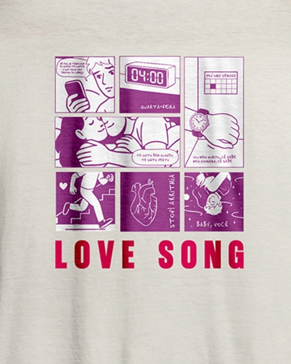 Na frente, o coração desenhado à mão por Matheus Torres e a frase que marca o ritmo da canção: “Stop! Arritmia". Nas costas, a HQ completa inspirada na música Love Song, com versos transformados em cenas que contam uma história romântica e real.