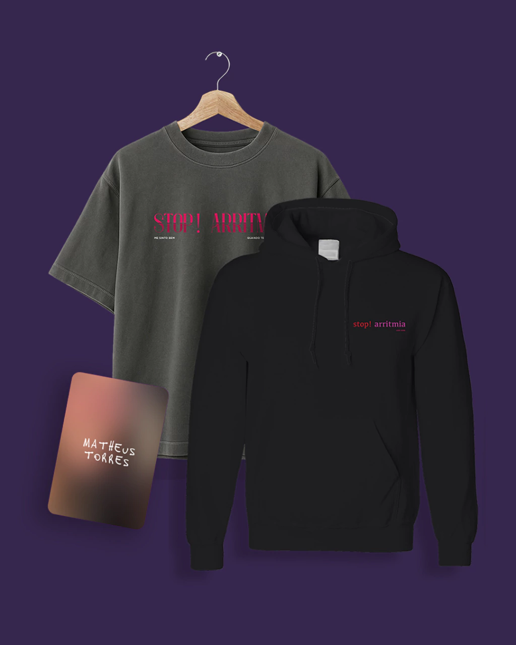 O kit é composto por: 1 Camiseta Oversized Love Song + 1 Moletom Stop! Arritmia + 1 Photocard Autografado.