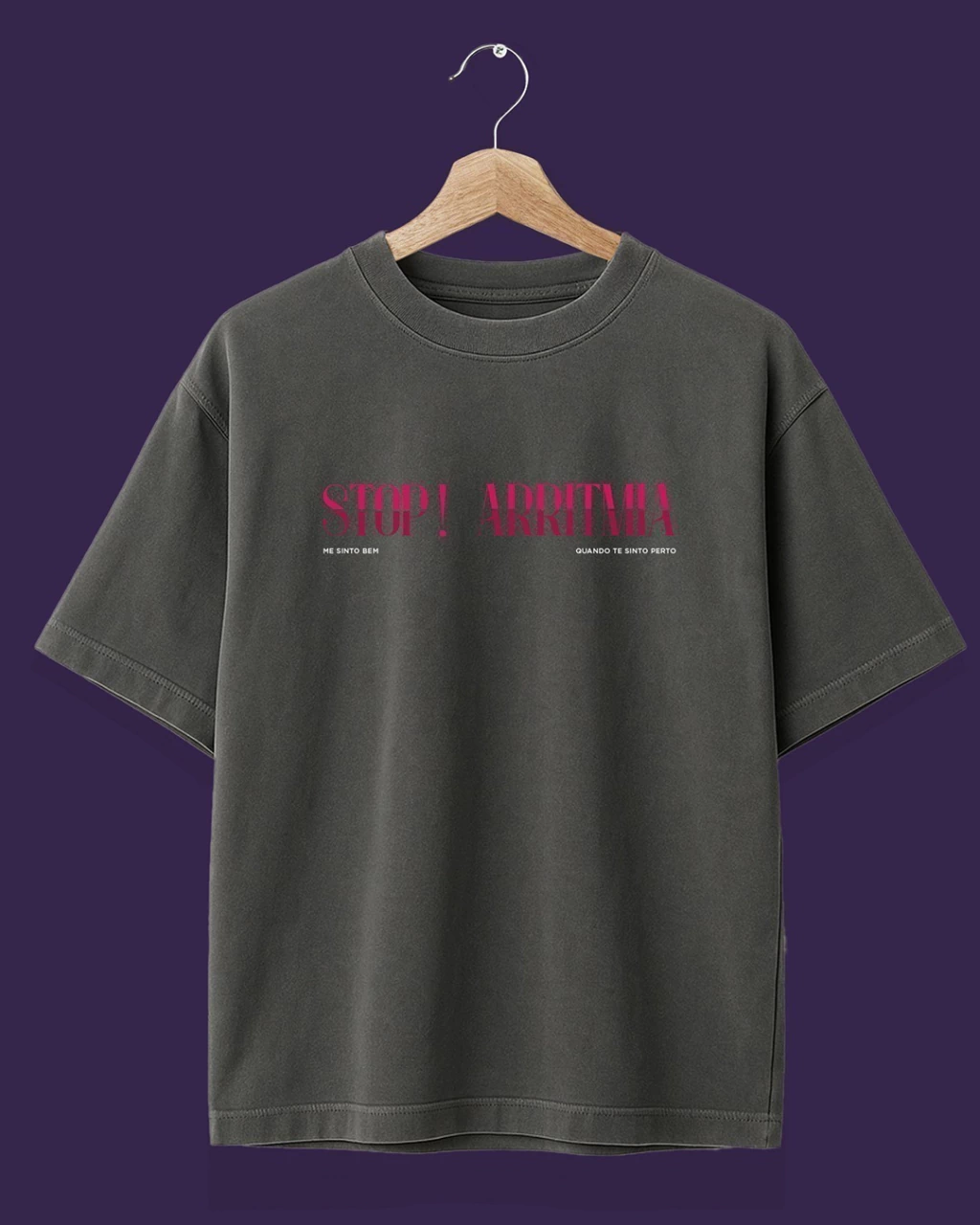 Camiseta Oversized Love Song - “Stop! Arritmia” na frente e trechos de Love Song nas costas, celebrando um amor leve, divertido e cheio de conexão, pra viver cada batida.