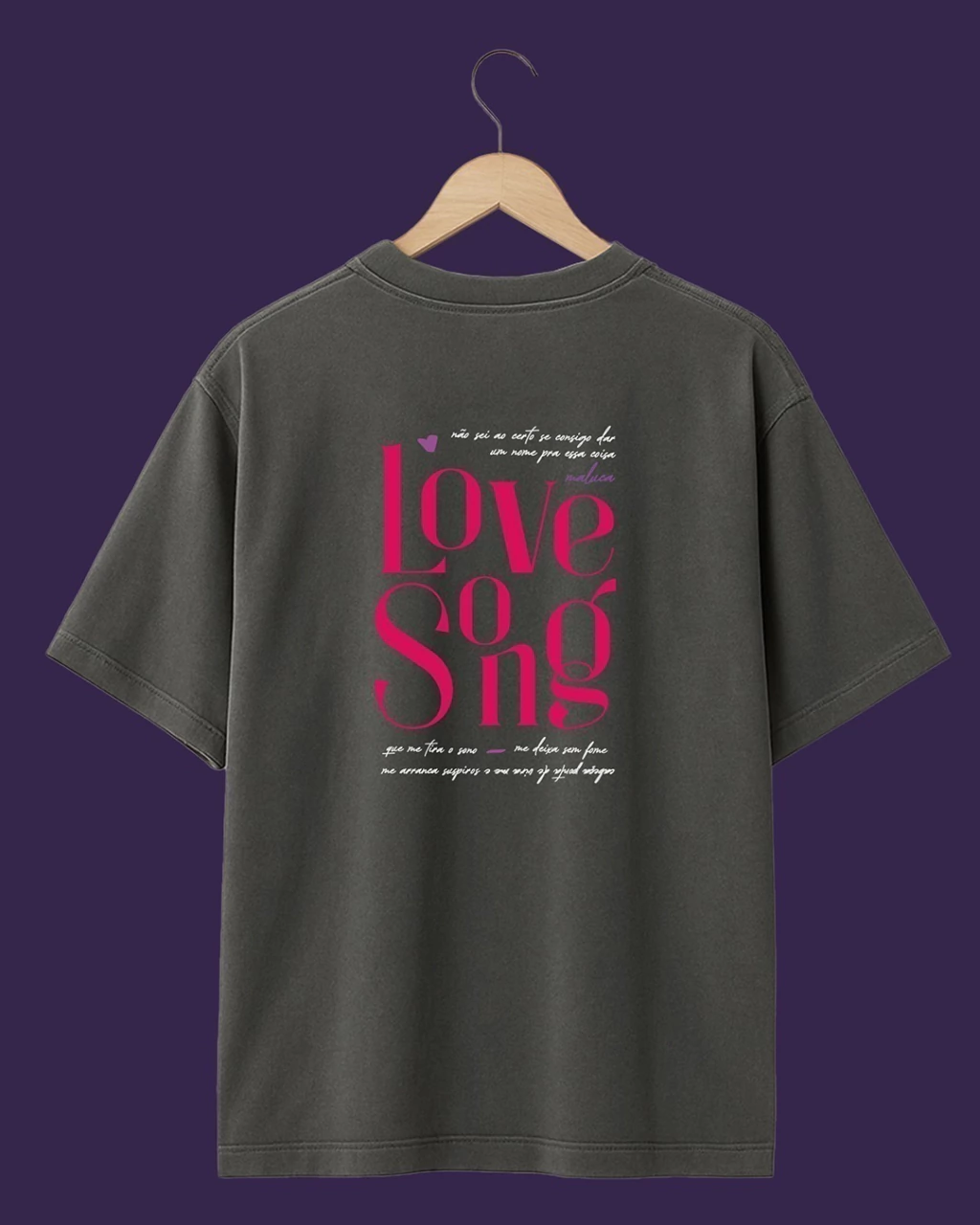 Camiseta Oversized Love Song - “Stop! Arritmia” na frente e trechos de Love Song nas costas, celebrando um amor leve, divertido e cheio de conexão, pra viver cada batida.